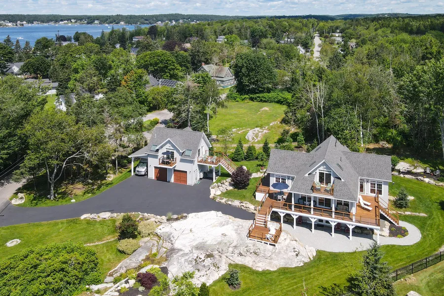 Welcome to 'Spruce Ledge', a unique and beautifully appointed property situated on desirable Spruce Point. Strategically designed to maximize light from sunrise to sunset, cool ocean breezes and amazing views, this custom home is built into the lot's dramatic feature, Spruce Ledge itself. Renowned Maine natural stone designer Joe Norton created a plan with natural stone walkways and landscape features, all using the stone that originated from the property to blend into a park-like design within a tidy .68-acre parcel. As you step inside this captivating home you are immediately greeted with a sense of tranquility and casual comfort. Light and bright, the 4 bedroom, 3 1/2 bath main home includes an abundance of open living space, a gas fireplace, floor to ceiling windows and a first-floor primary suite. Sip your morning coffee overlooking the beautifully landscaped grounds, read a book or watch a variety of passing boats from your choice of expansive decks. A stunning carriage house studio suite above an oversized heated garage provides a bonus as extra space for guests, a home office or as a rental income opportunity. Rounding out the package are extras like an on-demand full house generator, both water and air treatment, security system and newly installed yard irrigation. Boothbay Harbor is a truly special place to work, live and play! Take in the outer harbor and ocean views on a short walk to the award-winning Spruce Point Inn. Hop into town to enjoy the restaurants, shops and galleries. Enjoy the nearby botanical gardens, an award-winning golf course and numerous land trust hiking trails. 1.5 hours to Portland Jetport, 3 hours to Boston Logan airport. This state-of-the art turnkey property is a must see for anyone desiring a quality year-round home located in an amazing spot in mid coast Maine.