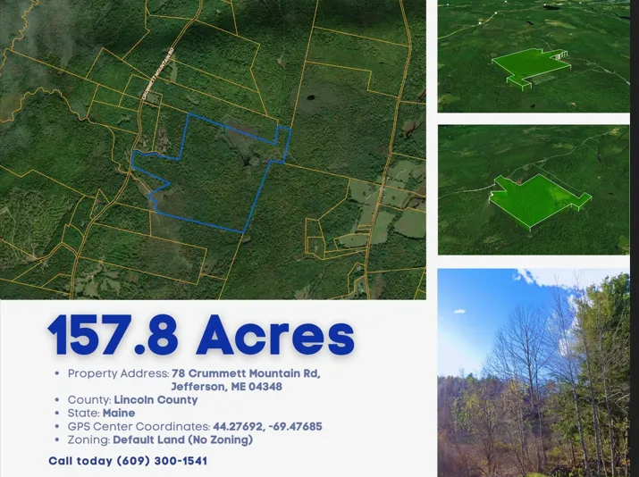 Seize the opportunity to own this vast 157.8-acre parcel of wooded land located on Crummett Mountain Rd in Jefferson, ME. Just 15 minutes from the scenic Long Pond and 30 minutes from Augusta, this property offers endless possibilities due to its no-zoning designation.