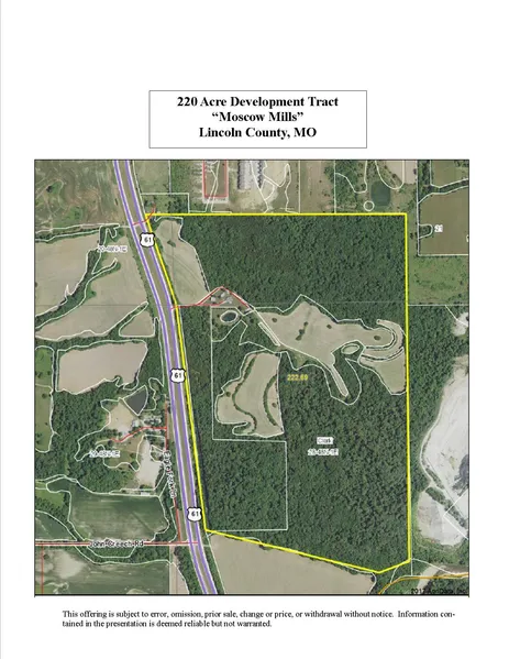 220 Acre Development Tract Moscow Mills, Lincoln County, MO. This 220 Acre property is located in Southern Lincoln County, just south of Moscow Mills on Highway 61. The property has 178 acres wooded with 42 acres open with ranch home. The tract is only 1/3 mile from the city limits of Moscow Mills at Crossroads Blvd. and has over 3/4 mile of State Highway 61 road frontage. This Prime Development tract has many options and is just North of the Lincoln/St. Charles County line. $2,310,000/$10,500 per acre