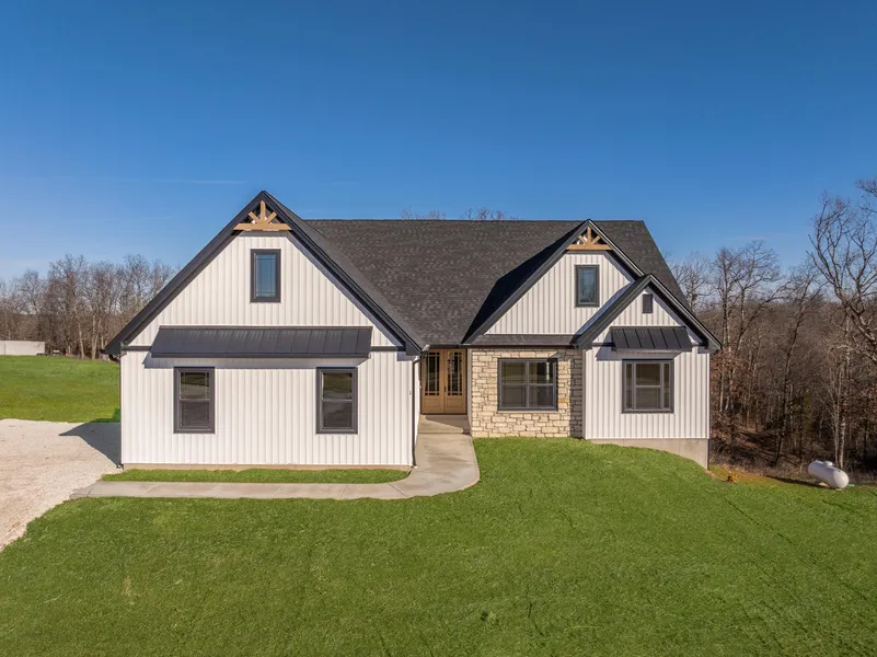 The search is over! A home of truly remarkable craftsmanship that checks every box sitting on 5+/- acres in Silex, Mo! This brand new home boasts 1950 sq ft of living space with 3 sizeable bedrooms and 2 full bathrooms. Enter through the 8ft nearly full glass door into your open main living space with 11 ft ceilings. Living room features a stone wood burning fireplace adjoined by recessed built in shelving, coffered ceiling with box beam inlay and a wall lined with over-sized windows accompanied by transom windows that let in so much natural light you'll never need to touch the light switch. The kitchen is magazine-cover worthy with full quartz counter tops, huge center island with farmhouse sink and enough cabinet space that the only thing you'll need to keep in the 8x5 pantry is food! Master bedroom is large enough to be considered its own apartment and has a 9x7 walk-in closet and ens...