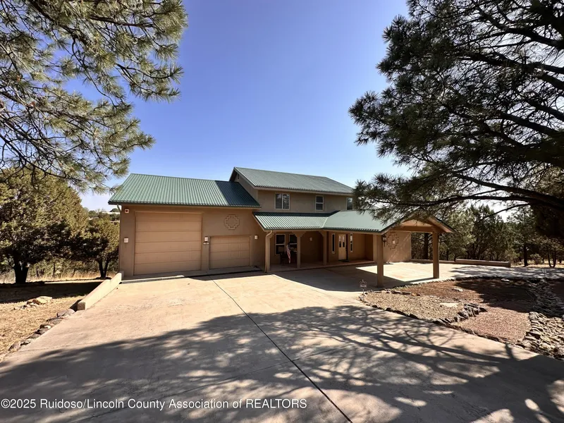 Stunning Alto Golf Membership Home on Two Lots - Exceptional Views! Nestled on 0.689 acres replatted two lots, well-maintained land, this 4-bedroom, 3.5-bath stucco home offers breathtaking wooded valley and Capitan Mountain views. Enjoy the best of mountain living with a metal roof, drive-thru porte-cochere and ample parking, including a one-car garage plus a high-door RV garage with workshop area. Living area with a cozy gas log fireplace, dining area plus breakfast nook along with a well-appointed kitchen with island and wetbar. Spacious covered back deck is ideal for outdoor relaxation and taking in the scenery. Main level master bedroom and convenient 1/2 bath nearby. Additional highlights are an office/study with a sleeping area. Security system and two CFA heat/ac un