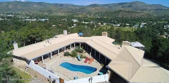 Step into a piece of Ruidoso history at this unique home where vintage charm meets modern comfort. This one-of-a-kind retreat offers an unforgettable escape, complete with a private pool and spacious courtyard. The wraparound patio welcomes you into a beautiful stone courtyard your personal oasis. Adding to the charm is the separate Casita, a private suite with direct access to the courtyard. Inside the main house, you'll be greeted by high vaulted ceilings, abundant natural light, and a spacious living area with expansive windows framing the stunning outdoor views. This property is truly a rare find!