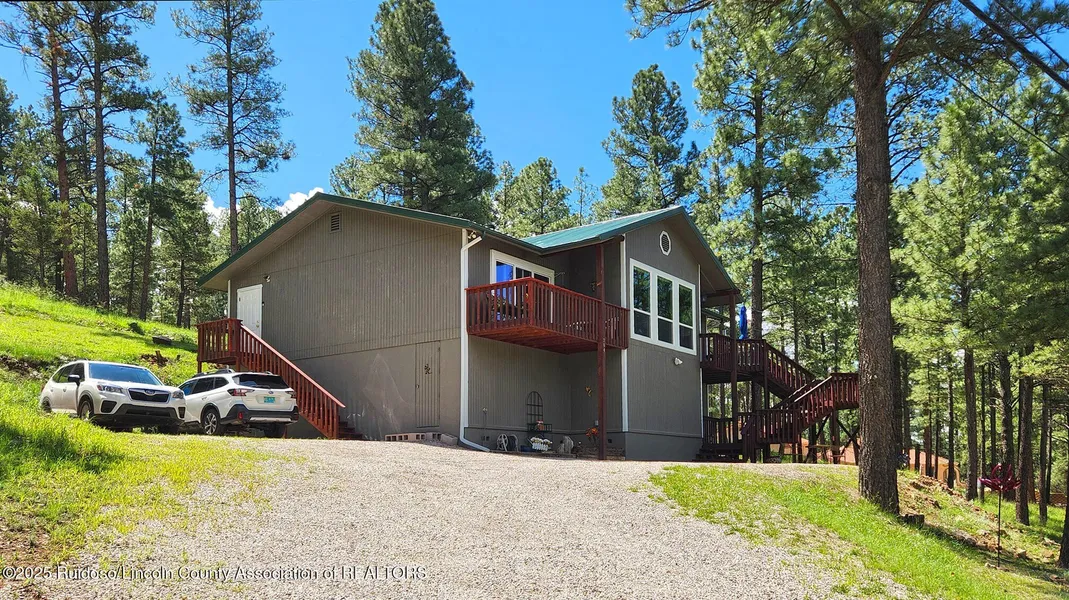Views! Views! Views! Sierra Blanca, Mountain Ranges & Towering trees... Updated, Immaculate Mountain Home on a large lot.... 3 Bedroom, 2 Bath, home nestled on a hill in Country Club Heights. Partially Furnished. Enjoy the Mountain Air, Abundant Wildlife that roam & the variety of birds from the Front Deck. Master Bedroom Balcony and back Deck Trex. Central A/C, Gas Log Fireplace, Beautiful floors, Lots of Natural Light thruout. Attractive waterproof laminate wood floors. The hot tub stays! **New Triple Pane Windows! Exterior Painted in 5-24. Front deck sealed in 25. Front staircase recently painted. Wonderful underneath space that is cool in the summer & warm in the winter;Workshop, Storage or Hobby area, This One is A Must See!! **Shown By Appointment