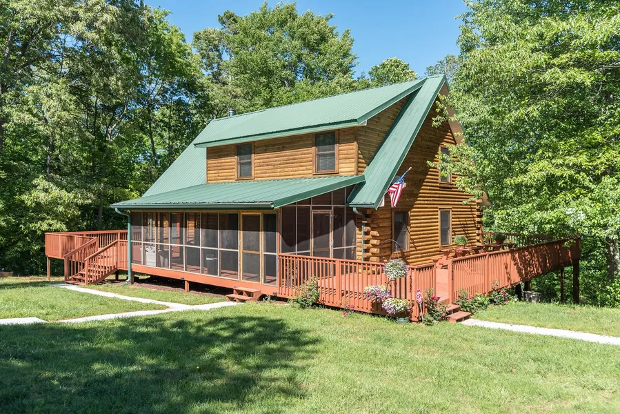 Creek 44ac of land :Log home solid pine floors, cathedral ceiling wood burning stove. 2heat pumps. Updated appliances. Master on main has walk-in closet bath has ceramic tile. Upper loft 2BD/ 1BA. Security.Storage garage / 4car carport deta. (tractor shed) (Barn storage building does not convey)old hmplace front of road is included. 3BD/1BA.Fresh paint & new cabinets & floor.MLS#3280100 $490,000