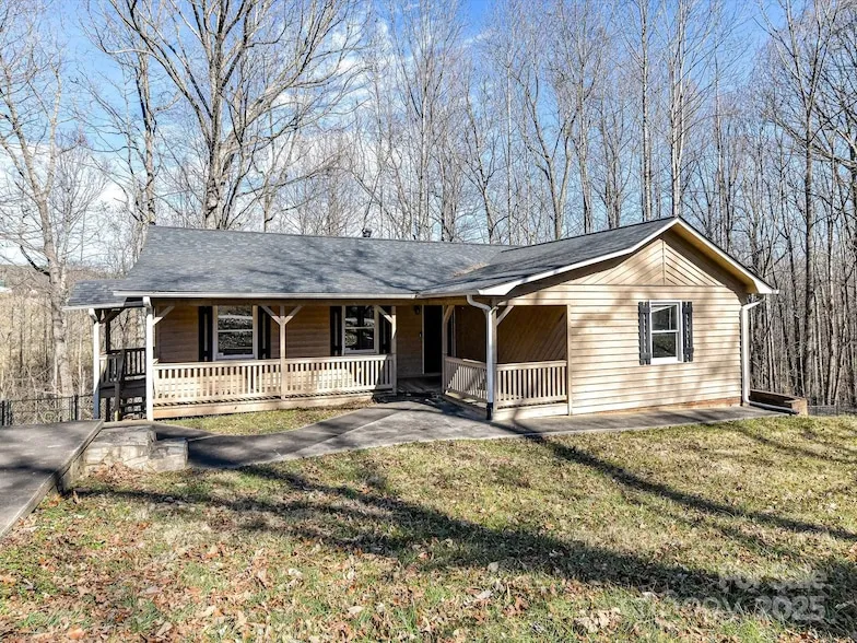Charming, 1 Story/Basement, 2 Bedroom, 2 Bath Home with expansive, covered front porch, located on 2.53 acres of wooded land in Lincoln County! NO HOA! The setting is like that of the mountains with home nestled in the tree tops & the sound of the creek rippling by! Open Plan with vaulted, wood beam ceilings! Kitchen features granite counters, stainless steel appliances, tile back splash, plenty of cabinets for storage, bar area with seating & spacious Dining Area with wrap around bench seating! Living Room with wood burning fireplace! Unfinshed Basement with so much potential! Kitchenette, Stone fireplace & Dog kennels in unfinished Basement! LVP floors installed in mid 2023! Both Full Baths updated in 2020! Kitchen updated in 2015! Roof replaced in 2017! HVAC replaced in 2018! Electric Water Heater replaced in 2015! Located just off of Highway 150! North Lincoln is a highly sought after school district school district in Lincoln Co!