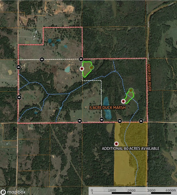 *An additional 80 acres located across the road to the south is also for sale and can provide income with a 30 acre agricultural field with a tower blind, additional feeders, and another mile of Deep Fork River frontage. 63 Acres on the north side of the property is also for sale and provides additional hunting/grazing and 5 ponds teaming with bass.