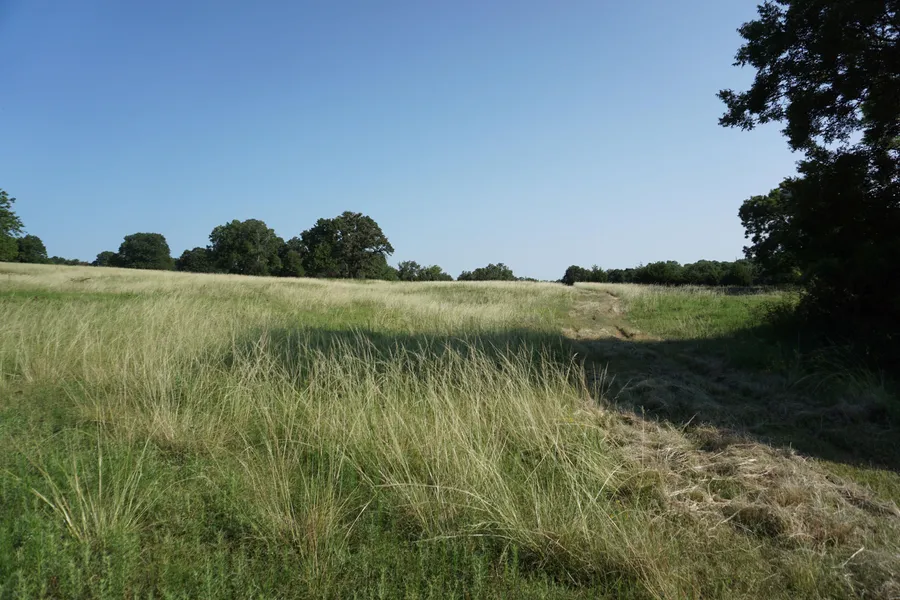 Comfortable 3 bed 1 bath frame home has vinyl siding and metal roof. Ideal for hunting cabin or place to live while you build. 65 acres, approx 45 acres of mixed improved and native grasses, small creek, 2 farm ponds stocked with bass, crappie and catfish, balance in scattered woodland with numerous towering native pecan trees. Numerous old farm barns are in place adding character to this quaint old farmstead. Storm cellar is in place and has recently drilled water well. Farm fronts on county maintained road, just 1 mi. to State Hwy.