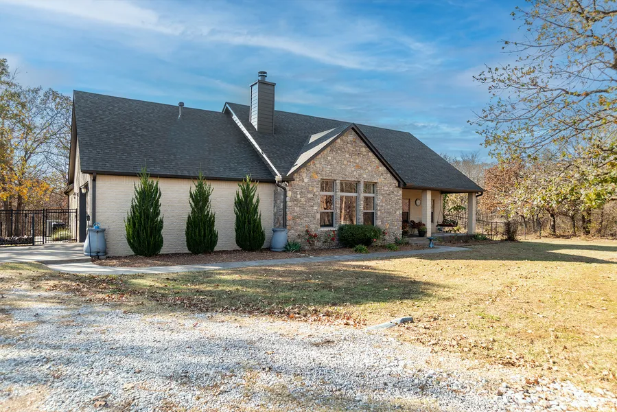 Looking for the perfect escape from city life and into the tranquil countryside settings. Perfectly situated halfway between OKC and Tulsa, the property offers 74.6 mol acres perfect for hunting or outdoor recreation activities, stunning modern farmhouse, separate apartment (completely remodeled in fall of 2024), two large shops, gated front entrance, 4 ponds and lots of wildlife roaming over the property. The home sits nestled in trees, with amazing views from the large front porch. The home features 4 bedrooms, 2.5+ bathrooms, open living, dining and kitchen area and a large, enclosed sunroom for extra entertaining space. The split floor plan arrangement offers two spacious bedrooms downstairs each with their own private bathrooms and good-sized walk-in closets. The cozy living room has lots of natural light, high ceilings, hard wood floors, and opens to the kitchen and dining area. The kitchen has gorgeous granite countertops, stainless steel appliances, Frigidaire professional 5 burner stove, perfect island with seating and plenty of storage. Off the kitchen is a great half bath and laundry area. The main bedroom is oversized with a huge walk-in closet with tons of storage and an ensuite featuring double sinks with granite countertops, a huge soaking tub and a separate shower. Through the kitchen is a nice sunroom that is a great bonus for year-round entertainment. The sunroom overlooks a nice back yard. Large trees, plush landscaping with a sprinkler system, fire pit above ground storm shelter and large trex deck are just a few of the many perks of the wonderful outdoor space. Just a short walk from the house is the 30x50 shop with living quarters. The apartment was completely remodeled in the fall of 2024 and has a full kitchen, bathroom and living area perfect for a mother-in-law or an older college age student. The rest of the shop has concrete floors, electric, water and can be heated making it the perfect workshop. The second barn is a great equipment barn or could even be used as a livestock barn. Next to the shop there are 2 full RV Hooks with electric, water and septic. There is also a whole home back up Generac generator. As you move past the homesite area you will disappear into a hunter’s paradise. Deer and other wildlife inhabit the rest of the property perfect for any outdoor enthusiast. Trails around the property are a great way to escape and relax and unwind from the busy work life. Check out this amazing property and all it has to offer before someone else snatches it off the market.