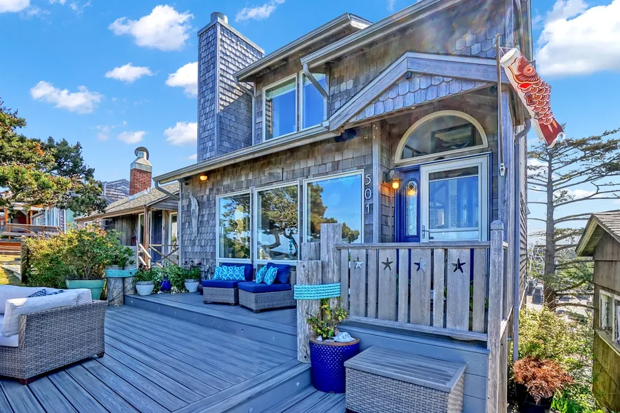 Imagine yourself at the top of the world from this hilltop oasis offering panoramic ocean views in the heart of Lincoln City near the D-River. This custom-built home takes advantage of expansive ocean, lake and mountain views. Centrally located to services with direct sandy beach access and walkable to the Cultural Center, Farmers Market, Kyllos Restaurant, Dutch Bros Coffee, Devils Lake and more. Recent top to bottom remodel features updated gourmet kitchen with quartz countertops, all new Caf appliances, soft-close cabinet hardware, built-in roll outs, updated lighting and wine cooler. New Luxury Vinyl Plank (LVP) flooring throughout. Luxurious spa-inspired primary bath with glass enclosed shower and rain head, dual vanity with quartz countertop, towel warmer and solar powered venting skylight. The entire upper floor and primary suite are vaulted with custom cedar T&G ceiling. Two private decks on the lake side off primary suite and main floor for morning sun and coffee. Expansive custom Trex composite beach side deck areas afford warm afternoon lounging on the deck and endless sunsets. Commercial zoning gives the ultimate flexibility of use including primary/vacation home or short-term vacation rental dwelling (VRD) options plus bonus additional front lower residential city lot currently used for off-street parking, storage and direct beach access. The owner also has recent architect plans to build a garage, ADU or single-family home on the included residential multi-family zoned lot (buyer to do due diligence). This cherished and unique custom designed home is being offered by the original owners. Please come see what could be your new Happy Place!