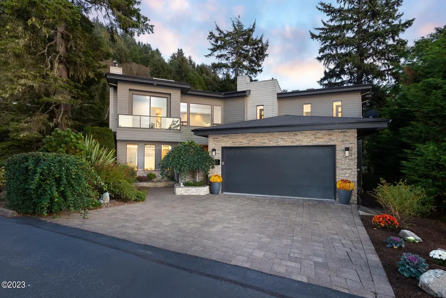 Ocean view bliss in the exclusive coastline gated community 'Sea Crest' in Otter Rock OR. This masterpiece was designed with both comfort and style in mind, lovingly maintained home updated in 2022. Surrounded by an elegantly landscaped garden and a forest oasis. A natural spring fed pond in the backyard is to be enjoyed from a large deck. Private gate welcomes you to a lushly landscaped courtyard displaying the main entrance, a romantic cedar wood spa with a hot tub, as well as a separate guest bedroom with a private bathroom. Light and airy living area provides open flow with dramatically high coffered ceilings. Dark wood floors give this 3,240 square feet home dynamic beauty.