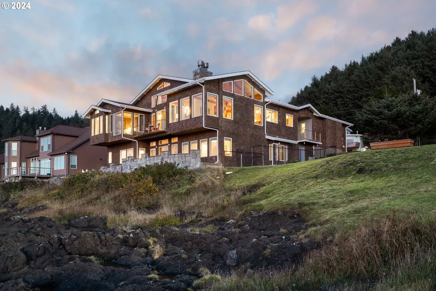 Perched on the basalt cliffs at Cape Foulweather, this oceanfront property redefines luxury living on the Oregon coast. With exceptional privacy and expansive views of the Pacific Ocean, it's a rare gem for buyers. Every detail has been meticulously crafted to create a welcoming yet elegant atmosphere. Large west-facing windows offer stunning vistas, where you can watch gray whales breaching just offshore, framed by the coastal landscapes tranquil sunsets and dynamic winter storms. The chef's kitchen is a culinary paradise, featuring a Wolfe cooktop, Dacor and Asko appliances, granite countertops, and a 300-bottle wine room. This space flows into refined living and dining areas, ideal for both intimate gatherings and grand entertaining. Enjoy cinematic experiences in the fully equipped home theater or cozy up by one of the three fireplaces. With five spacious bedrooms, including two prim...