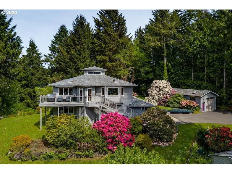 West-facing, overlooking Alsea Bay, with expansive sunset views this home offers a private and secluded 1 1/2 acres atop Shepards Point. This property boasts many evergreens and over 60 rhododendrons. This is a meticulously maintained and updated 4 bedroom, 2-1/2 bath home. It was constructed of 2x6 walls throughout with interior walls and floors fully insulated making it a warm and quiet home. Large wood-clad double pane windows throughout provide lots of warm, natural light, along with skylights in the living room and dining room. New carpeting and flooring was recently installed in the living room and dining room. The newly remodeled kitchen boasts granite countertops, hickory soft-close cabinets, loads of workspace, and new appliances. This home has an on demand hot water circulation pump in conjunction a new high efficiency water heater delivering hot water quickly and efficiently. The elegantly remodeled master bath also features granite countertops with double sinks along with a tiled walk-in shower. The large master bedroom has a walk-in closet and sitting/reading area and new carpet. The second bedroom upstairs has its own private balcony. On the lower level is a large third bedroom/family room with its own view of the bay, a guest bedroom, a full bath, large utility room, and laundry room.The fully insulated and heated wood shop could easily be converted for a motor home or other toys. 240v is available in the shop. This home has a propane generator with a 500gal tank; a covered private hot tub; as well as a stainless steel sink/workspace for cleaning fish or crabs if that s your passion. The property also has its own well and osmotic water treatment system, and boasts plenty of delicious, clean water.