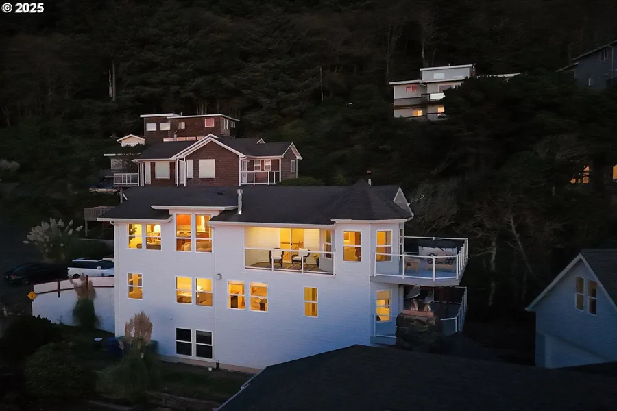 Expansive Ocean Views in Highly Coveted Roads End! Experience the magic of coastal living with breathtaking ocean views and radiant sunsets that make you feel like you are part of the scenery. This custom-built, three-level home, completed in 2004, offers nearly 5,000 sq. ft. of luxurious beachside living, blending elegance and comfort in every detail. Effortlessly navigate all three levels with the convenience of a large, custom elevator, ensuring accessibility and ease. The heart of the home is an entertainer's dream kitchen, perfectly paired with an open-concept dining and living area, ideal for hosting gatherings or simply soaking in the view. The spacious primary ensuite features an adjacent whale-watching room for serene mornings or quiet evenings. Step directly from the primary suite into your private hot tub to unwind under the stars. With ample space and thoughtful design, the possibilities are endless to tailor this home to your vision. Don't miss the chance to own this stunning gem in Roads Endwhere luxury meets the beach.
