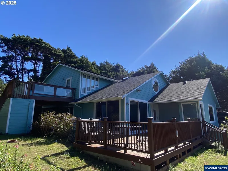 OCEAN VIEW Home w/Large windows & deck to enjoy the view from Generous sized living room w/large picture window. Nice kitchen/dining combo w/two 9-foot sliding doors encompassing awesome views of the ocean and opens to the deck for outdoor living space. Main level bedroom w/office space, upper primary suite w/newer walk-in Kohler shower and separate office space that could be converted to a 3rd bdr. w/closet addition. Main level bedroom w/shower.