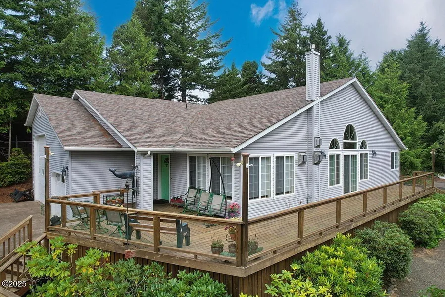 Custom-built and meticulously maintained, this charming home offers a serene, half acre park-like setting with mature landscaping. Inside you will find 2 bedrooms, 2 bathrooms, a large kitchen with newer appliances. The great room glows with abundant natural light and has a gas stove for cozy coastal nights. The front sitting room also has a gas fireplace for added warmth and charm. The primary bedroom includes a loft with a distant, but picture perfect view of the ocean. Enjoy outdoor living on the spacious deck, perfect for entertaining. The property features an RV garage with full RV hookups and with a dedicated workshop space in back. Nestled in a slightly protected area, the home enjoys some shelter from coastal winds. A rare blend of comfort, functionality, and natural beauty