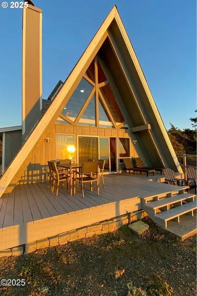 Above The Waves is a one-of-a-kind oceanfront A-frame nestled on 1.23 private acres in the serene coastal community of Seal Rock, Oregon. With a private drive, direct private beach access, and sweeping ocean views from two levels, this beautifully remodeled home offers the perfect blend of modern comfort and classic coastal charm. The light-filled main living area features dramatic west-facing windows, an electric fireplace, and opens to a spacious oceanfront deck ideal for enjoying sunsets or dining under the stars. The updated kitchen includes quality finishes and a functional layout suited for both casual meals and gourmet cooking. This unique home features three true bedrooms, each on its own level to provide privacy and flexibility. The luxurious primary suite occupies the entire top floor and showcases panoramic ocean views, a spa-inspired ensuite with a walk-in shower, and a dedic...