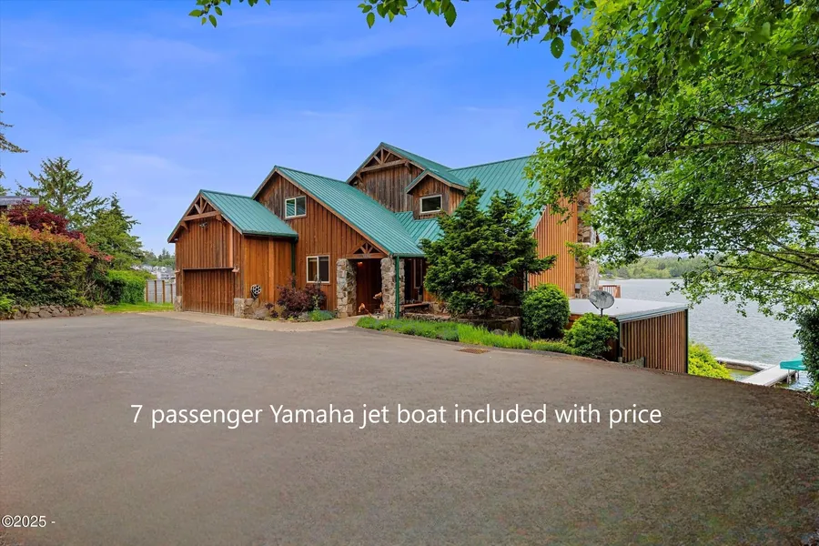 7 passenger Yamaha jet boat with accessories, as well as a canoe and 2 kayaks all INCLUDED with home! This stunning custom lakefront home perfectly blends luxury, comfort, and natural beauty. The seller has recently completed the installation of a gabion basket retaining wall along the lakefront side of the house, with all work professionally done by Sexton Construction. Situated on a quiet 0.53-acre lot with approximately 190 feet of lake frontage, this expansive 3,923 sq ft home features 5 bedrooms, 4 bathrooms, a den, and an entertainment room, providing ample space for hosting family and friends. A wall of windows allows natural light to fill the space while offering breathtaking views of Devils Lake from nearly every room. Step outside onto the large back deck that overlooks the lake, creating an ideal setting for relaxation or entertaining. Water enthusiasts will appreciate the private dock, private boat ramp, aqua lift, and boathouse which make lake access effortless. Although the property offers privacy and serenity, it is just minutes away from Lincoln City and the ocean. This home is offered turnkey and fully furnished for immediate enjoyment. Everything you need is already here including quality furnishings, window treatments, media set up and security system. A complete inventory list will be provided with an acceptable offer. Showings are by appointment only. Please note that audio and visual monitoring is in place both inside and outside the home.
