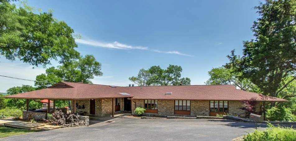 Designed by an architect who apprenticed under Frank Lloyd Wright, this home was built in 1958-59 on 7.98 acres within Fayetteville, TN city limits and 40 minutes from Huntsville, TN. It is situated on a private circle drive at the end of a dead-end street in a peaceful setting conveniently close to city amenities. Constructed of limestone quarried from the building site, the home is beautifully adorned with redwood exterior trim and cypress decks. It features 3,740 square feet of living space, 4 bedrooms and 3.5 baths, an office with separate outside entrance, and a spacious walk-out basement with floor-to-ceiling glass louvered doors on the east wall. The basement also features a fireplace and a 24x16...