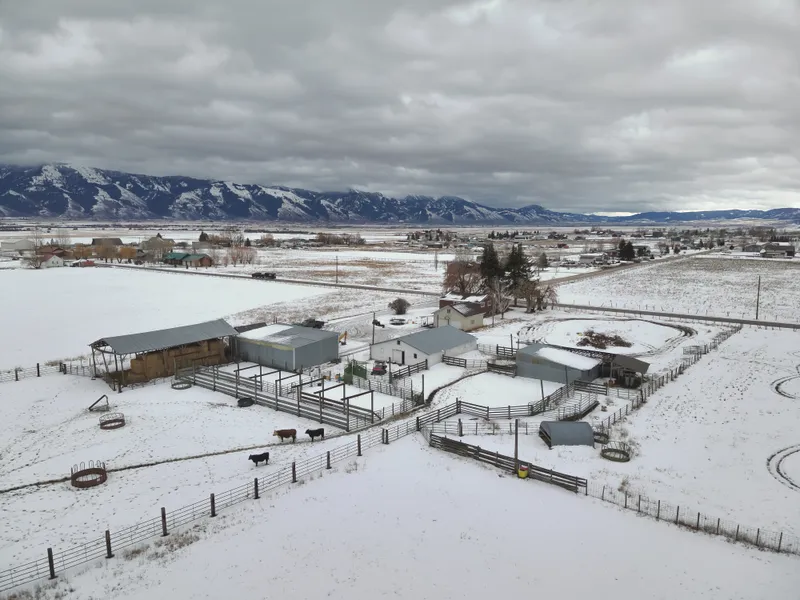 The property includes a 3-bedroom, 2-bath ranch home, complemented by multiple barns and functional outbuildings, creating an ideal setup for a working cattle ranch, horse property, or hay operation. The land consists of highly productive grazing ground and hay ground, well-suited for livestock and agricultural use.