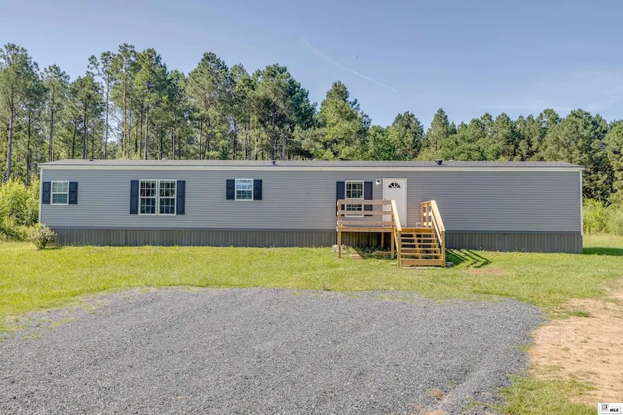 Enjoy the best of both worlds quiet country living with the convenience of being just 10 minutes from the heart of Ruston, Louisiana. This well-kept single-wide mobile home is situated on a beautiful lot and features a welcoming wood front porch and a gravel driveway. Inside, you'll find an open-concept layout that begins with the cozy living area and flows into a designated dining space complete with built-in shelving and a buffet perfect for entertaining or family meals. The kitchen features warm brown tones, updated appliances, and ample cabinet space for all your storage needs. Just off the kitchen is a laundry room that opens to the spacious backyard and a small back porch ideal for enjoying peaceful mornings or evening sunsets. The primary bedroom, located on the left side of the home, is filled with natural light from large windows and features brand new carpet. The en-suite bathroom offers a double sink vanity, a large soaking tub, a separate shower, and a generous walk-in closet. On the opposite end of the home are two additional bedrooms, both with brand new carpet and nicely sized closets, as well as a full guest bathroom. This property is a great opportunity for first-time buyers or anyone looking to downsize and enjoy a quiet, country setting with city amenities just minutes away.
