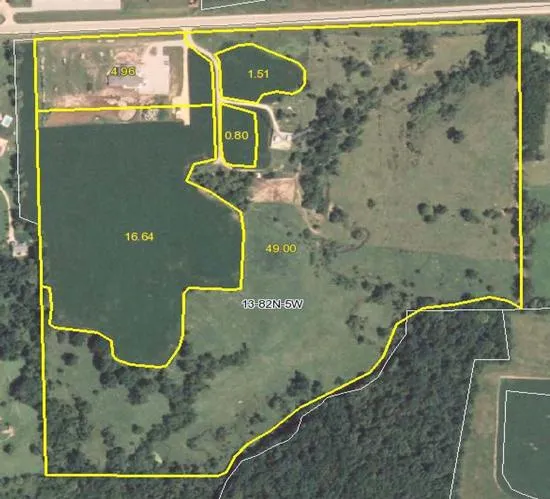 68 acres, m/l, located on east edge of Lisbon along Highway 30. There are 20 acres of cropland with balance in pasture and timber. Includes cell tower income. Ideal commercial or residential development. $5,500/A