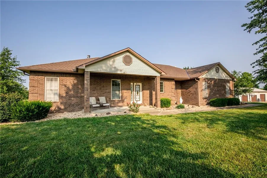 Beautifully maintained 5 bed, 3.5 bath custom built brick home with a full walkout basement. Open concept in the main living, kitchen, & dining area. Walks out to upper patio, and very spacious rooms. Master bed and bath on the main floor. Bathroom and bed rooms downstairs for family, guest or extra living suite. 9ft ceilings, fireplace, extra kitchen and entertainment/living area. Tons of windows providing natural light and walkout double doors. Ground source heat pump, HVAC system provides efficient energy & electrical making for great savings given the size of this home. Two car garage. Large oak shade trees, rolling meadows, multiple traps and a pond give this property a big feel. 50x30 shop with roll up doors, concrete floors, and electricity. Home sits just off K-7 Hwy minutes from town down a secluded tree lined drive all on 13 acres!