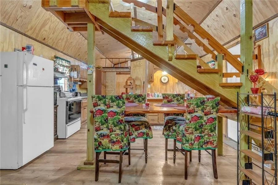 Enjoy lakeside living with this charming and move-in ready cabin located in the private community of Sugar Valley Lakes. Nestled at the base of a wooded hill and just steps from the big lake and boat ramp, this well-maintained property offers the perfect blend of comfort, convenience, and natural beauty. The cabin features 1 spacious master bedroom with walk-in closet and half bath, a full bathroom with shower, and a large 10x15 sleeping loft-ideal for kids, grandkids, or extra guests. The open-concept kitchen and living area is designed for both relaxation and entertaining, complete with a folding dining table for flexible space. Modern amenities include a full kitchen (all electric), washing machine, a heat pump/AC system, and even an antique wood stove for cozy evenings. Outdoor living is a highlight with a 10x20 deck leading down to an 8x20 patio featuring a working outdoor fireplace with grill, plus a double swing to enjoy the peaceful surroundings and abundant wildlife. The property also includes an extra garage for boat or jet ski storage, RV parking with hookup, outdoor and indoor security cameras, and a private water system with multiple storage tanks and on-demand supply. Residents of Sugar Valley Lakes enjoy access to seven lakes, a 9-hole golf course with cart rentals, clubhouse, swimming pool, playgrounds, campgrounds, and year-round community events. Conveniently located just one hour south of the Kansas City metro, this property offers the ideal escape-whether for weekend getaways, family retreats, or full-time lake living.