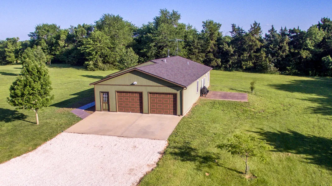 Centerville KS 200 Ac M/L Farm on Blacktop with 3 bed 2 bath modern home featuring an open concept kitchen with center island, west patio outdoor views, attached 2 car garage. Newly installed slate stamped concrete patio & sidewalk. The garage is equipped with state of the art wood working system & more. Very nice 30'x 50' metal building with a nicely laid out guest suit. 40' x 30' Cedar hay barn. 10 Meticulously maintained acre lawn is complimented by 1 1/2 miles of trails through rock bottom creeks. Beautiful wildflower meadows and undisturbed forest.