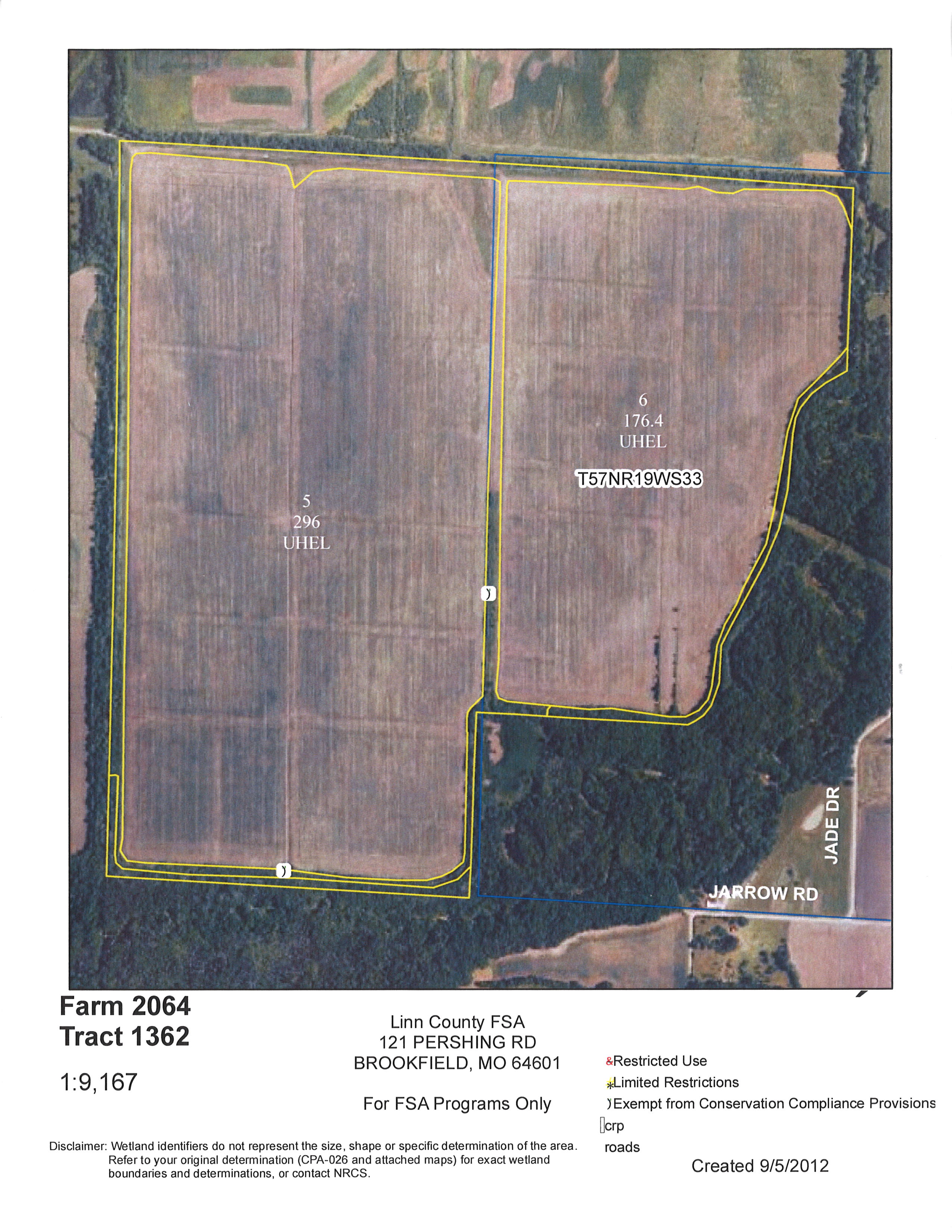 520+/- Acres of Levee Protected Row Crop Land in Linn County Missouri. Farm is located South of Brookfield Mo on 11 Hwy app 3.5 miles to Icarus Rd. Then East on Icarus road app 1.5 miles to farm. Of the 525+/- total Acres, approximately 472.4+/- Acres are FSA Tillable Acres. Farm is entirely protected by a privately owned levee system. CHANGE, PLEASE NOTE: Auction Will be held at Elks Lodge 114 E Wood ST, Brookfield,Mo March 13, 2013, Start time 10:00 AM.