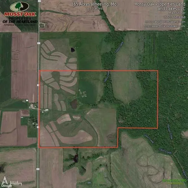 365 Acres in Wheeling Mo that has 254 acres of cropland. This property lays very well. There is 26 acres that is across the live creek that also could be tillable to make extra income. Or leave it in cover and food plots for a deer and turkey sanctuary. The deer and turkey sign was everywhere you looked, the trails looked like highways. There are two barns on the property, right of a secondary highway for easy access. There is a big pond, so if you like to fish and play in the creek, this property is for you. The cropland brings in 40,000 cash rent. You could throw in another 4000 in a hunting lease for more income. The owner will also sell a 100 acre tract, which will be mainly recreation and hunting land. Don't pass up this great investment, call Mike Stoner at 573-774-9775 Cell