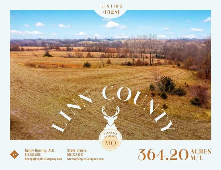 Peoples Company is pleased to offer 364.20 acres m/l in Linn County, Missouri! Property consists of 303.51 FSA Cropland Acres of which 285.11 acres are currently in row crop production carrying a tillable NCCPI rating of 61.3. The balance of the property includes timbered draws, ponds, and 18.40 acres enrolled in a CRP contract until October 2022 with an annual payment of $1,826. The CRP practice is CP1 (permanent grasses). Primary soil types include Armstrong clay loam, Purdin loam, and Armstrong loam. The farm offers several timber lined ditches meandering through the property serving as a travel corridor for wildlife. Several high vantage points would be ideal locations for tower blinds catching deer moving from feeding to bedding areas. Ponds are stocked offering additional recreational opportunities as well as a water source for wildlife and or livestock. This property includes a d...