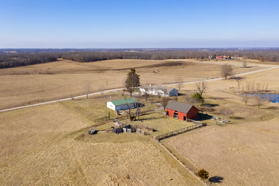 Pristine 4 BR, 3 BA 2772 Sq. Ft. Home on 59 Acres!! Acreage is Fenced & Cross Fenced Including 4 Stocked Ponds Nice Older Barn that has been Resided & Roofed in 2016 w/ Corral Area Immaculate Home w/ Lots of Natural Light & Skylights Open Kitchen w/ Modern SS Appliances Including Gas Range, Island, Coffee Bar & Walk In Pantry Oversized Living Room w/ Vaulted Ceilings Family Room w/ Gas Fireplace Huge Primary Bedroom w/ Walk in Closet & Spacious BA w/ Jetted Tub Covered Patio Off Primary BR 3 Other Nice Sized BR Dedicated Custom Office w/ Built In Shelving Additional Storage in Loft Area Large Laundry & Utility Room 30 x 40 Detached Garage w/ Heated & Cooled Office Home & Property is Extremely Well Maintained & Ready for Cattle or Horses!! Call Today!!