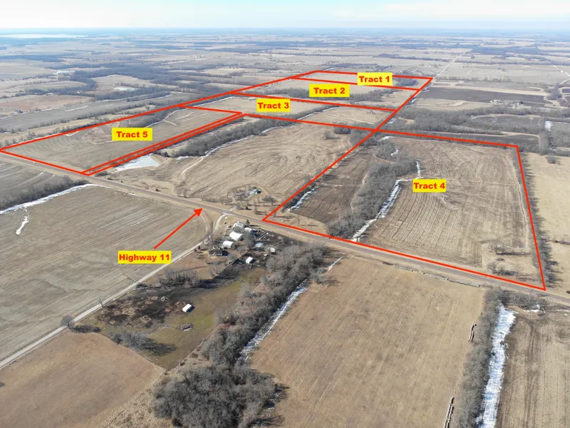 Tract 4: 83.7 Surveyed Acres accessed by Highway 11 along the East border. FSA indicates 61.94 tillable acres. Tract offers a beautiful building site in the northeast corner with mature trees. Farm is well maintained and terraced. Electric is located across Highway 11.