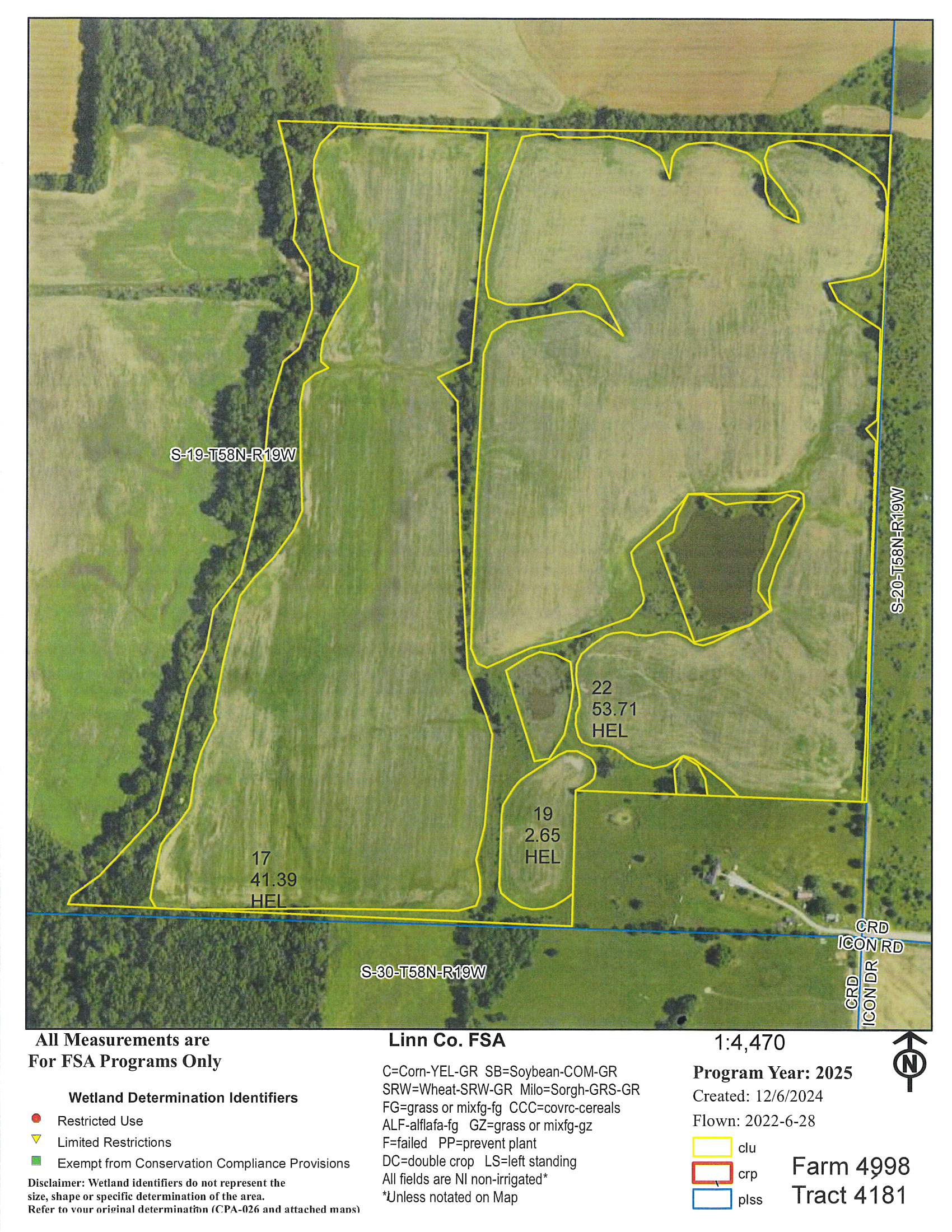 For those looking to enhance the propertys appeal to wildlife, theres plenty of potential. The 56.32 acres of tillable crop fields situated in the hills could be converted into conservation projects such as CP-38 or CP-1 programs. Turning the hill ground into CRP (Conservation Reserve Program) land would not only improve wildlife habitat but also extend quality conservation efforts further east onto the property, creating a thriving ecosystem for years to come.