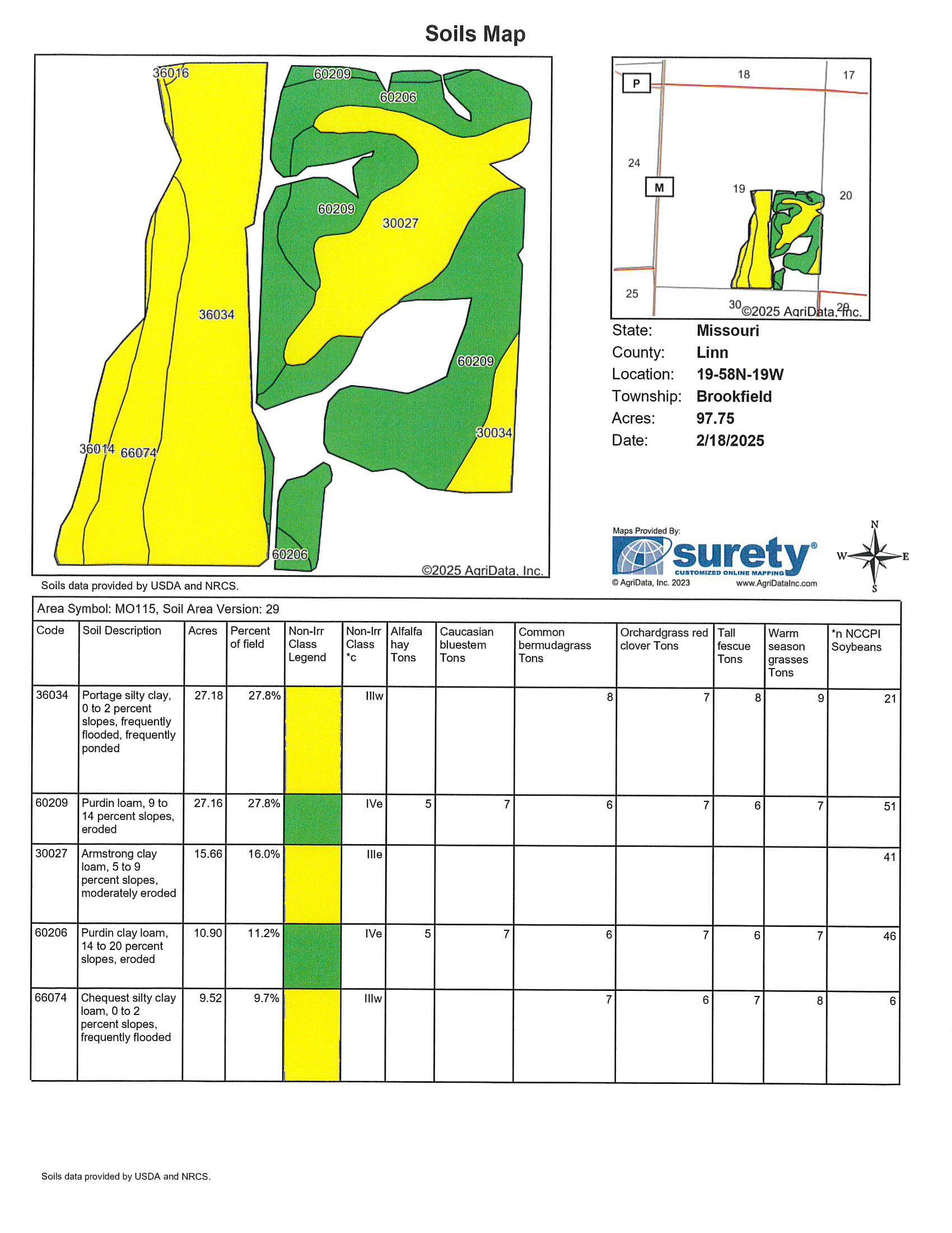 Tillable Land & Farming Potential: With 97.75 acres of tillable land, including 56.32 acres in the hills and 41.29 acres of productive bottomland, this property offers excellent agricultural potential. The bottomland, in particular, is known for its fertility and could be farmed for a variety of crops. The current farmer is willing to continue working the land if desired, or the new owner can decide how to proceed with the farming operations. This flexibility makes it an ideal property for those who wish to invest in agriculture, whether for personal use or as a business opportunity.