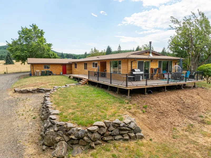 Discover the perfect blend of privacy and convenience on 5+ acres, ideally situated on a dead-end road. Enveloped by approx. 3 acres of timber, this 3 bedroom home greets you w/ ample natural lighting. The living room offers a wood stove, perfect for chilly evenings, and a slider that leads to a large beautiful deck overlooking the serene surroundings. The kitchen features a propane range, tile backsplash, pantry storage shelving, & ss appliances. Generator hook up is ideal in the times of power outage. There are various fruit trees & ample space for a garden. The oversized detached garage provides parking for 2 cars, a home office, & storage space. There is plenty of room for RV & boat parking. Desirable location w/ the convenience of nearby amenities while enjoying rural tranquility.