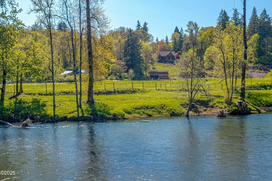 Located off I-5 45 minutes from Eugene and Portland. Discover this incredible Santiam Riverfront property featuring approximately 200 feet of private riverfront access, this over 5-acre property offers fishing, boating, rafting, and enjoys the peaceful natural surroundings. The land includes a five strand New Zealand fenced pasture suitable for cattle, horses, or other farm animals. The beautiful reproduction loft style barn, three-bay equipment storage and finished multi-use finished shop. Two RV pads, including 30/50 amp power, water, & septic hook-up. This acreage property has paved circular driveway and shop w/concrete floors, furnace, water, bathroom & finished loft. This hand scribed custom log home boasts solid construction and unique features, offering an open concept.