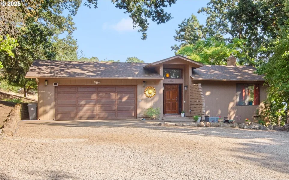 Enjoy the timeless appeal of this mid-century modern 1975 ranch home, nestled on 8.97 acres, offering privacy, gorgeous views and peaceful country living all within 2 miles of I5. This 3-bedroom, 2-bath home features vaulted cathedral ceilings, open atmosphere, large picture windows natural light and sweeping views of the Willamette Valley. Inside, you'll find retro charm throughout-including original woodwork, built-in's and a cozy stone fireplace with new wood burning insert and a new HVAC system. The open layout includes new LVP flooring throughout the living areas, a spacious living room with vaulted ceilings and patio doors that open to a large deck, a dedicated dining area, bonus room and functional kitchen with new stainless steel appliances, island and ample storage. The primary bedroom features an en suite bath with private patio, two additional bedrooms and a second full bath provide ample space for family, guests, or a home office. Outside, you'll find a brand-new 11.5 KW solar system with a 25-year warranty, designed to generate enough power in the summer to offset most of the home's winter energy needs, a new 10x20 lofted shed, a 10x12 standard shed, in-ground sprinkler system, two hot water heaters, back patio wired and plumbed for a hot tub, RV parking, dog run, 4ft walk-in storage area in crawl space, fruit trees and an on property camp site where you can enjoy a camp fire and watch the wildlife. Whether you're dreaming of a small hobby farm, room for animals, or simply space to breathe, this property delivers.