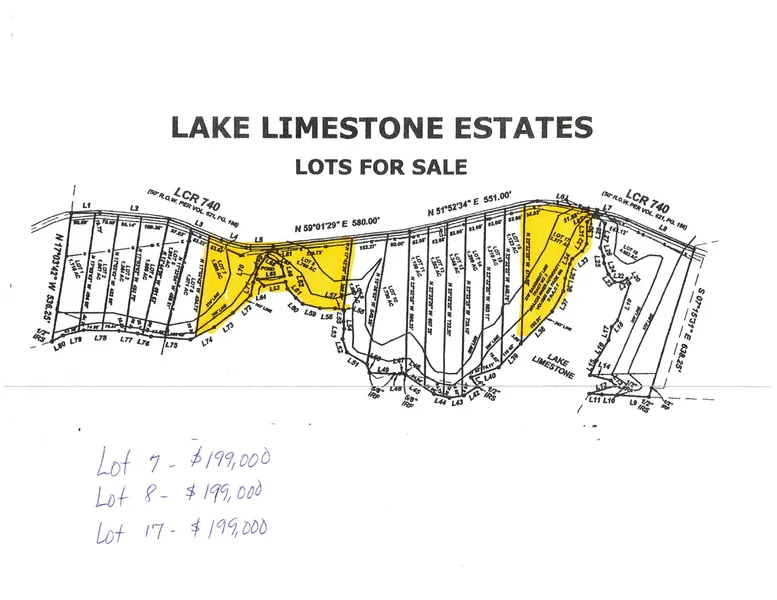 Lot 7, (1.606 ac), Lot 8 (1.766 ac), Lot 17, (2.377 ac) in new subdivision on West side of Lake Limestone. Partially cleared waterfront lots. Electricity available. Conveniently located near Running Branch Marina.