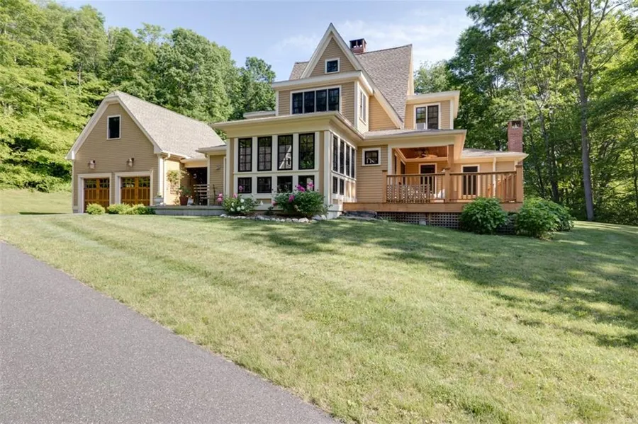 Privacy abounds this lovely home in a peaceful setting. Built in 2009, this is an ideally sized 1-1/2 story country house with lots of light, very efficient and affordably maintained. Home has beautiful four-season exposure to the outdoors with an abundance of windows, French doors, two covered porches and an open deck. Home sits on a knoll accessed by winding paved driveway with a stone bridge. Interior features a second story master bedroom suite with fireplace and master bathroom. The second bedroom is downstairs with fireplace and adjoining study. Wood stove in the family room and a full unfinished basement for limitless uses. Additional living space includes a large partially finished bonus room above a two-car heated garage. The detached guest cottage includes a kitchen, full bath, bedroom and enclosed porch. Shed at the entrance to the property with underground utilities and wood ...