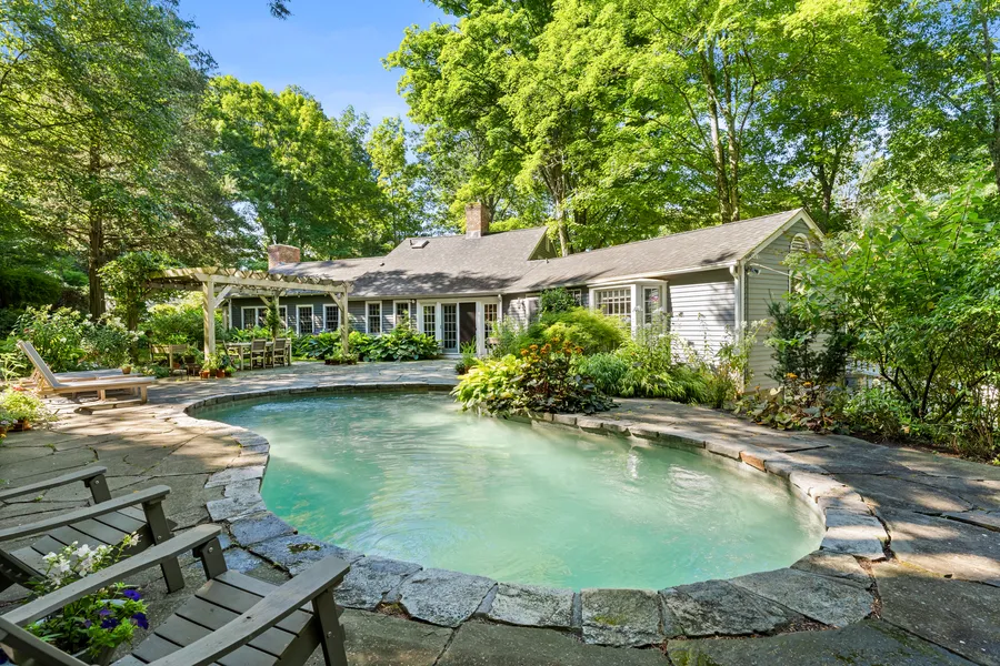 French doors in the kitchen lead to a Scott pool with granite coping and expansive flagstone decking anchored by a stone chiminea on one end and an outdoor dining area covered by a trellis on the other. Jack's Brook travels through the northern boundary of the grounds on its final approach to joining the Shepaug River. Over thousands of years it has cut a stunning path through glacial rock formations, creating a mini gorge featuring several fishing pools and waterfalls. It is an exceptionally dramatic setting from which to enjoy a picnic lunch or meditate overlooking the rushing water. Your own, private waterway of State Park caliber.