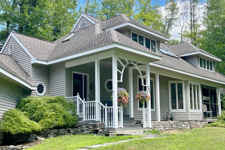 Hardwood flooring throughout main living areas, livingroom with cathedral ceilings and floor to ceiling cut granite fireplace, primary bedroom suite with walk-in closet, newly updated bath with sauna, first floor office / den, three spacious second floor bedrooms, newly updated bath, and loft family room, separate office / guest suite with private entry. Screened porches, open decks, multi zone heating and a/c. All within a few minutes to tennis, pool, pickle ball, playground, clubhouse with fitness center, sandy beaches, and boat marina.