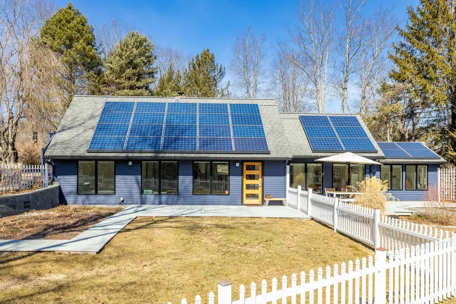 This exquisite contemporary home, nestled on two lush acres and framed by picturesque stonewalls, offers a serene retreat with modern updates and luxurious amenities. The single-level design, complemented by an airy loft, boasts an open floor plan that radiates with natural light, thanks to the addition of new windows. The heart of the home, a newly renovated kitchen, features quartz countertops, recessed lighting, skylights and top-of-the-line stainless steel appliances, all set against the backdrop of stylish engineered wood flooring that extends throughout the residence. The sun-drenched great room is a masterpiece of design, with a soaring stone wall and a cozy wood-burning stove, creating an inviting space for relaxation and entertainment. The spacious dining room, with its cathedral ceiling, offers views of the beautifully landscaped yard, inviting the outdoors in. Retreat to the primary bedroom, a sanctuary of comfort, complete with a large organized closet. The primary bath has been transformed into a spa-like haven, complete with heated flooring and a sumptuous soaking tub/shower combination. The home also features a convenient laundry closet with a stackable washer and dryer. Privacy is paramount with two additional guest bedrooms located on the opposite side of the home, each served by a remodeled guest bath that includes a steam shower and heated floors. The loft/office, accessible by a few steps, provides a versatile space for work or leisure, with its own private entrance. The home's mechanical features are equally impressive, including solar panels, on-demand hot water, and central air conditioning. Recent upgrades such as a freshly painted exterior, a new retaining wall and a new septic tank underscore the home's turnkey status. Outside, the property is complete with a detached one-car garage and a charming red barn, adding to the country allure of this modern haven.