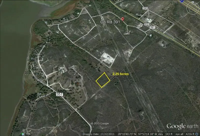 Corner lot at end of the road with rolling terrain and great views from hilltop. Directions from Corpus Christi, IH 37 N to Exit #40 (Mathis FM 888) left, then right on 3024, then left on CR 391 across from Mathis Acres. Follow road to right, then along waterfront to end of road and left on caliche. Lot is at end of caliche road.