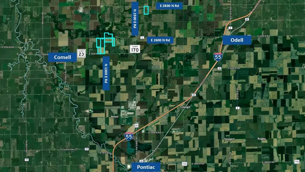 From the I-55 Odell Exit, drive west on 2600N for 7 miles to the farm on both sides of the Road.