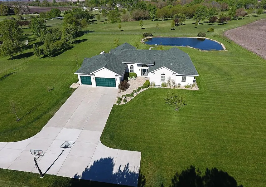 Well-appointed Estate Home on 2.5 acres located on 7th fairway of the Dwight Country Club. Blueprints available for this custom architect design, built with high end materials and attention to detail, premium 2 x 6 exterior walls, 6 panel solid oak doors throughout, new roof with architectural grade shingles in 2016, large size arched windows in foyer, master bedroom and family room, arched windows in dining room and guest bedroom. Vaulted ceilings in master bedroom, family room and living room. Exposed structural wood beams in kitchen 36 ft x 18 in and in master bedroom 20 ft x 10 in, Gas fireplace in family room, living room, double sided master bedroom and master bath. This brick with vinyl accent ranch home offers 4 bedrooms, 3.5 Baths and 3 car attached garage. Main level 3,100 sf with natural lighting throughout offers 3 essential living areas. Kitchen offers high end stainless appliances, granite, Maple cabinets, pantry and opens to breakfast and family room. Dining Room is open to Living room. Huge master bedroom suite with deluxe bath, bay window and walk-in closet with dressing area. Amenities include double sink vanity with granite top, fireplace overlooking 2 person Jacuzzi tub, separate 6 ft custom built ceramic tile shower with double shower heads and clear glass shower doors. Master bath has 4 heat sources; house heat, heater with fan in shower, heated floor and fireplace. Master Suite has one of three entrances to court yard overlooking professionally landscaped lawn, golf course, 10 fruit trees and approximately 5,000 sf fishing pond with large-mouth bass, crappie and blue gill. 2 wells, one for home use, one for watering the landscaping. Full partially finished 3,100 sf basement has related living apartment with full bath, plus 4 unfinished rooms can be a recreation area or finished to fit your needs. 200 AMP electrical service set up for quick connect generator. Many possibilities for a home office with high speed satellite internet availability.