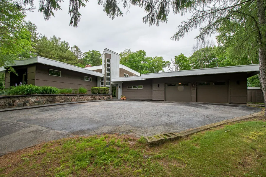 Mid Century modern gem situated on 1.5 acre hilltop lot with dock and beach access on all sports Crooked Lake! This stunning custom 4 bedroom, 3 bath home features hardwood flooring recently renewed, primary suite with fireplace and door wall to covered patio overlooking the beautiful gardens with stone walkway. Homes in this neighborhood rarely come onto the open market so showings are steady. Very private wooded lot with large patio landscaped to perfection and fenced backyard for pet lovers. Two car attached garage with egress into the backyard & storage shed for all the garden tools.
