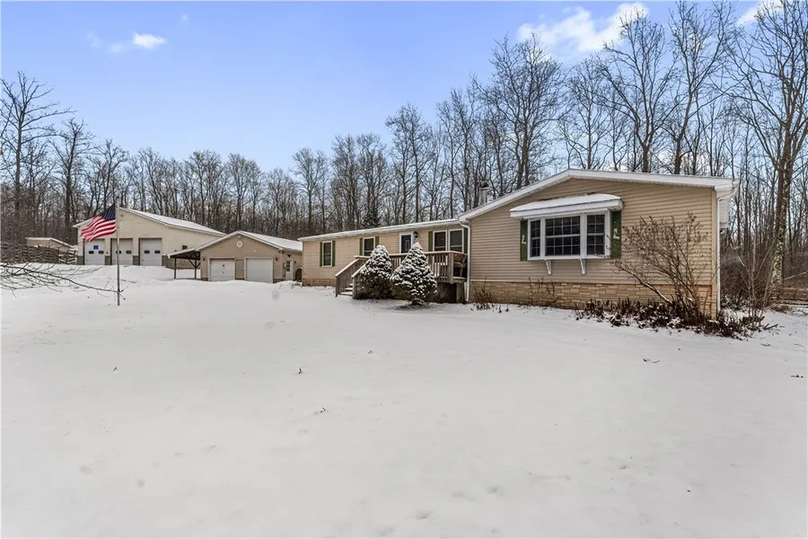 Quiet country living on nearly 4 wooded acres with tons of space! This property has it all! Desirable one floor living in this almost 1700 square foot home featuring an open floor plan kitchen/dining/living room area with a 28'x22' great room for entertaining, wood or pellet stove heating options to keep you cozy on those cold nights, lots of counter space & cabinets in the bright roomy kitchen, 2 large bedrooms with closet space, huge re-modeled bathroom featuring top of the line Monroe Industries products with its own baseboard electric heat & sitting area, and another bathroom space waiting to be designed to your liking! Attached to the home you will find the front deck area for sitting, and a covered rear deck that spans nearly the length of the house with plenty of outlets for you to get that hot tub & outdoor tv/bar area you've always dreamed about having! The garage closest to the house features 2 garage door bays, water treatment room, 200-amp electric service, storage room, furnace that burns waste oil, generator, concrete floors & front pad, and lean to for outside storage! The big shop features 3 garage door bays, concrete floors, 2 power lifts, 200-amp electric service, water access, propane fueled furnace, and bright overhead lighting! You get the best of everything with the storage/work areas in the garage buildings and the spacious family residence! Come see for yourself at the OPEN HOUSE on SUNDAY January 11th from 11am-1pm!