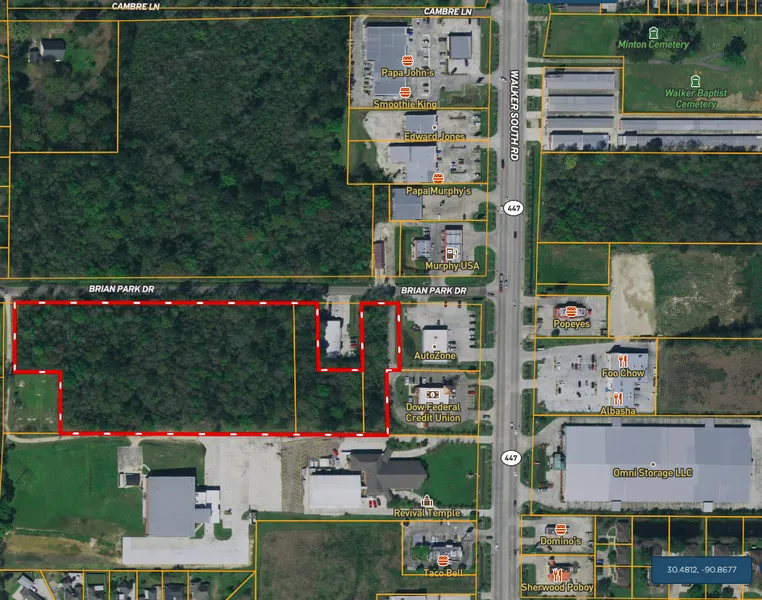 La Hwy 447 (Walker South Road) to Brian Park Drive (between Murphy Autozone), property on left, South side of Brian Park Drive between Brian Park and Revival Temple