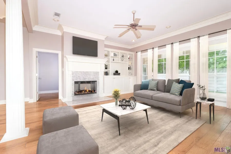 As you cross the threshold into the foyer of this charming, completely updated home, you are greeted by a large living room that boasts soaring ceilings and a plethora of light from a wall of windows! It contains a fireplace with lovely custom mantle and custom built-ins. Off of the living room is a spacious formal dining room, nice office, half bath and terrific kitchen that includes an eat-in breakfast area and bar. 3cm slab granite countertops, custom backsplash, and stainless appliances with a gas stove is sure to please the chef in the family! You will enjoy the custom cabinetry, including those with glass fronts. Imagine yourself in the primary en suite which expanses one entire side of the home, including large bedroom, large bathroom with custom tiled shower and dual showerheads, a soaking tub, dual vanities/sinks and dual closets. The split floorplan allowing 2 bedrooms and bath...